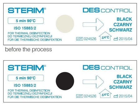 - DES CONTROL to chemiczne testy paskowe do kontroli dezynfekcji termicznej (90°C/5 min) w myjniach-dezynfektorach. Szybka, czytelna zmiana koloru, wersja samoprzylepna. Opakowanie 200 szt. Sprawdź szczegóły!